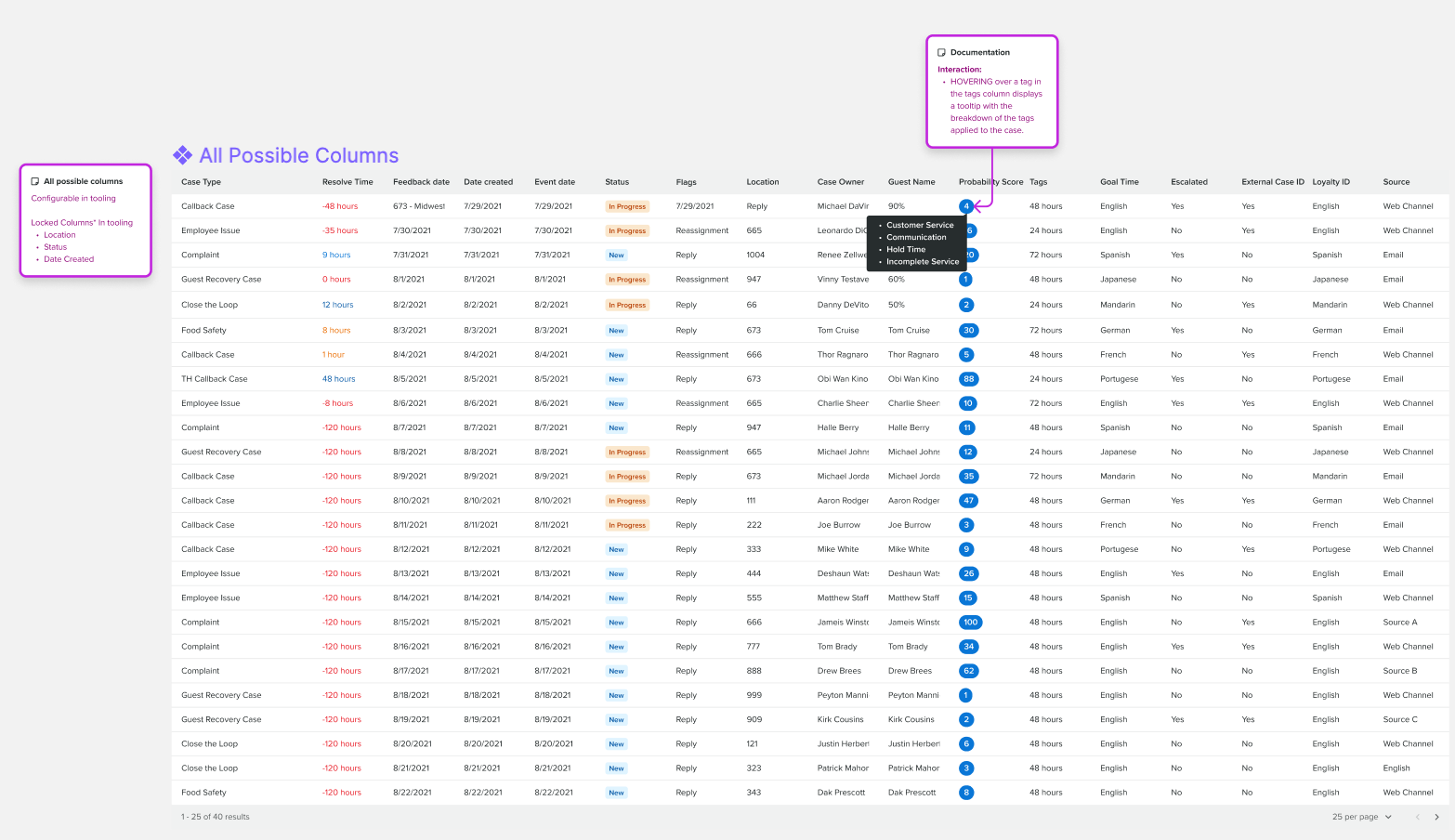 When designing for large amounts of users and data it’s important to understand the extremely rare situations. The amount of columns shown in this data table are configured by admin users during the initial setup process. The left image shows all possible columns users could configure as oppose to the absolute minimal amount shown on the right.