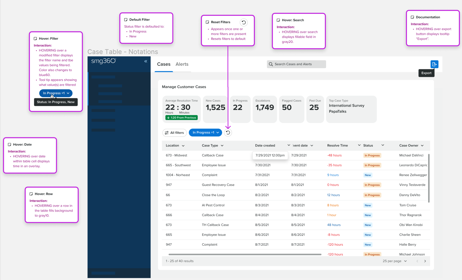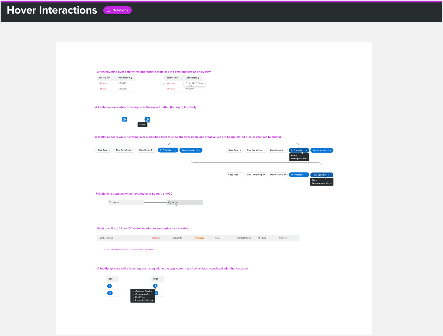 There are six different hover interactions within this data table that I have highlighted for accurate development.
