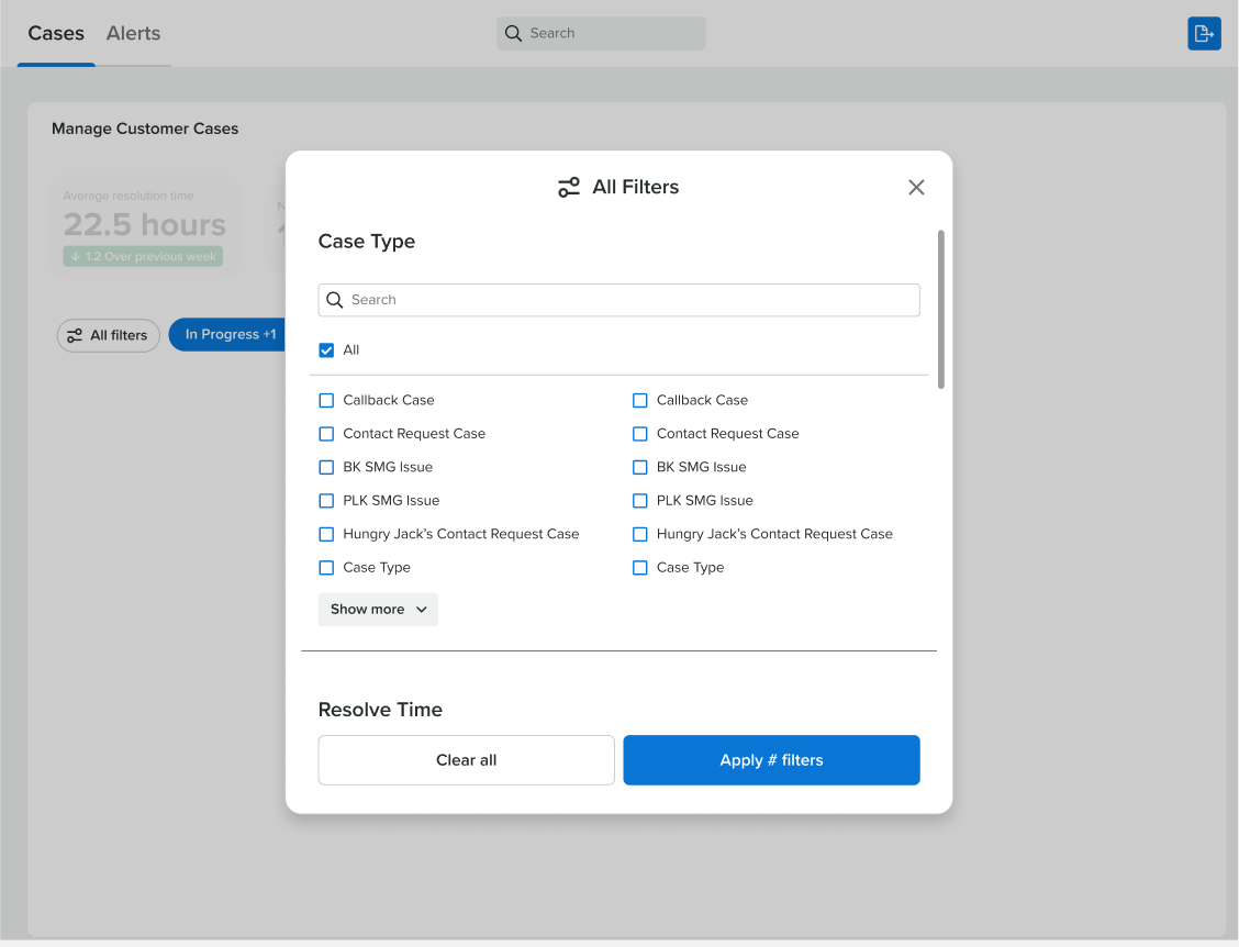 The all filters button opens a filter modal or pop-up that reveals all possible filters. Users can select filters within this modal and apply them directly to the case table. Each filter category that has been applied will individually display filter buttons along the top of the data table that can be edited.